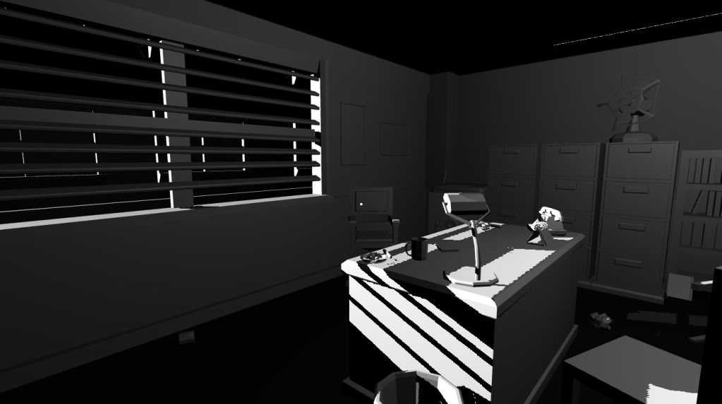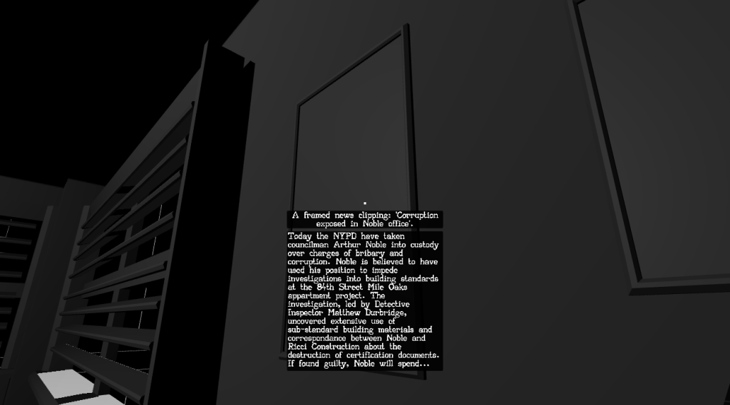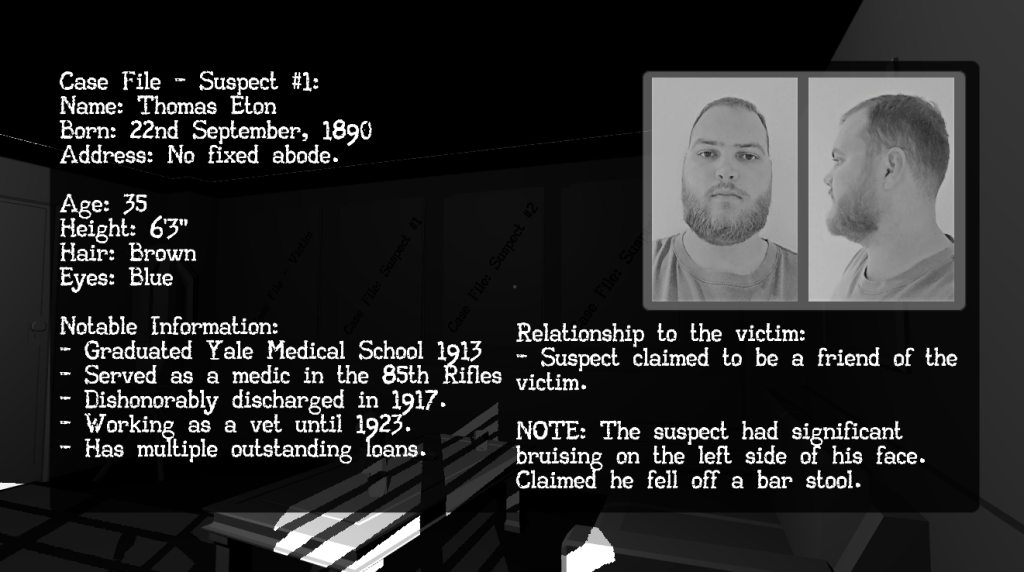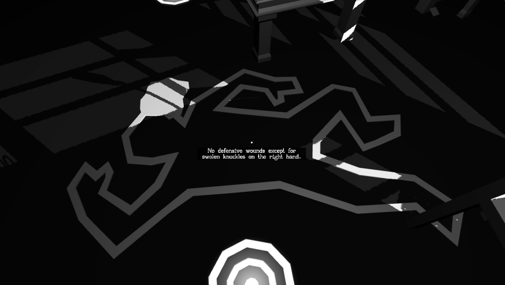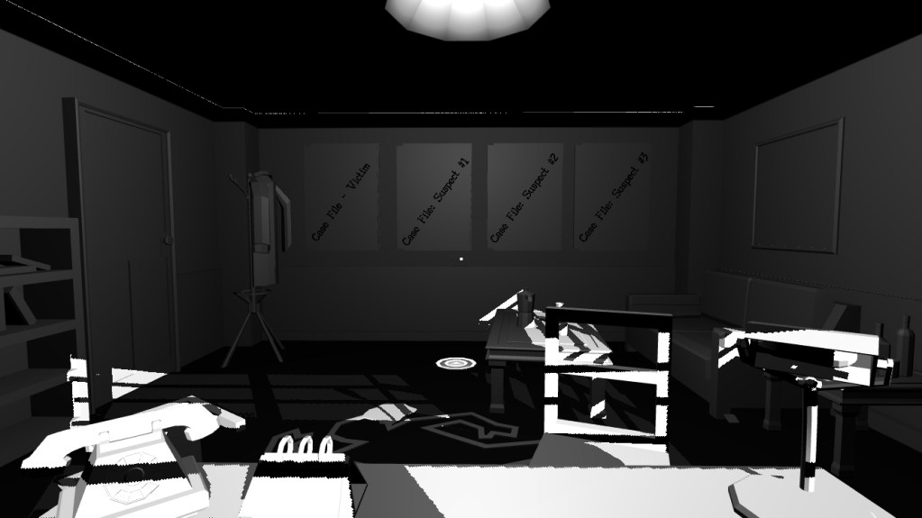 Investigation’s aesthetic draws on classic ‘noir’ detective fiction, with 1920’s set and dressing cast in greyscale and strong shadows. The models used in game maximise the use of the lighting with with simple structure and clean lines.